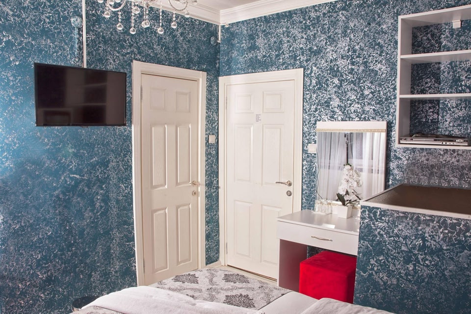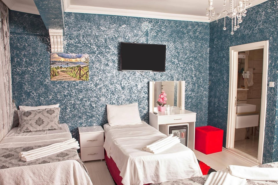 Single/Double Rooms Triple/Family Rooms Suites Rooms Sky blue Hotel Istanbul is equipped with a host of facilities and services to meet your every need including The glass see sky garden, The glass garden and the Turkish Breakfast served on the Hotel's garden. Other Services: 24 hour Front Desk, 24 hour Room Service, Daily Housekeeping, Laundry and pressing service and dry cleaning. Safety & Security: All of the hotels public are equipped for your safety with emergency alarm call systems, smoke detectors, automatic sprinkler systems, fire extinguishers and fire alarm buttons. Fire escape staircases are located on eachfloor. Your safety is our priotiry. Hair Dryers TV's with cable Guest Room Library 24 Hour Hot Beverage Service Private Bathroom Direct-Dial Telephones Wake up Service Safeboxes at Room Slippers Sewing kit iIon Shampoo, soap Jacuzzi Steam bath Spa bath Garden Cafe Restaurant Full Breakfast WiFi Wireless Internet Please Note: Cancellation policy: 48h before arrival. In case of a late cancellation or No Show, you will be charged the first night of your stay. Check in from 13:00 to 22:00 Check out before 12:00 Payment upon arrival by cash, credit cards. Taxes included. Breakfast included. No curfew. Non smoking.